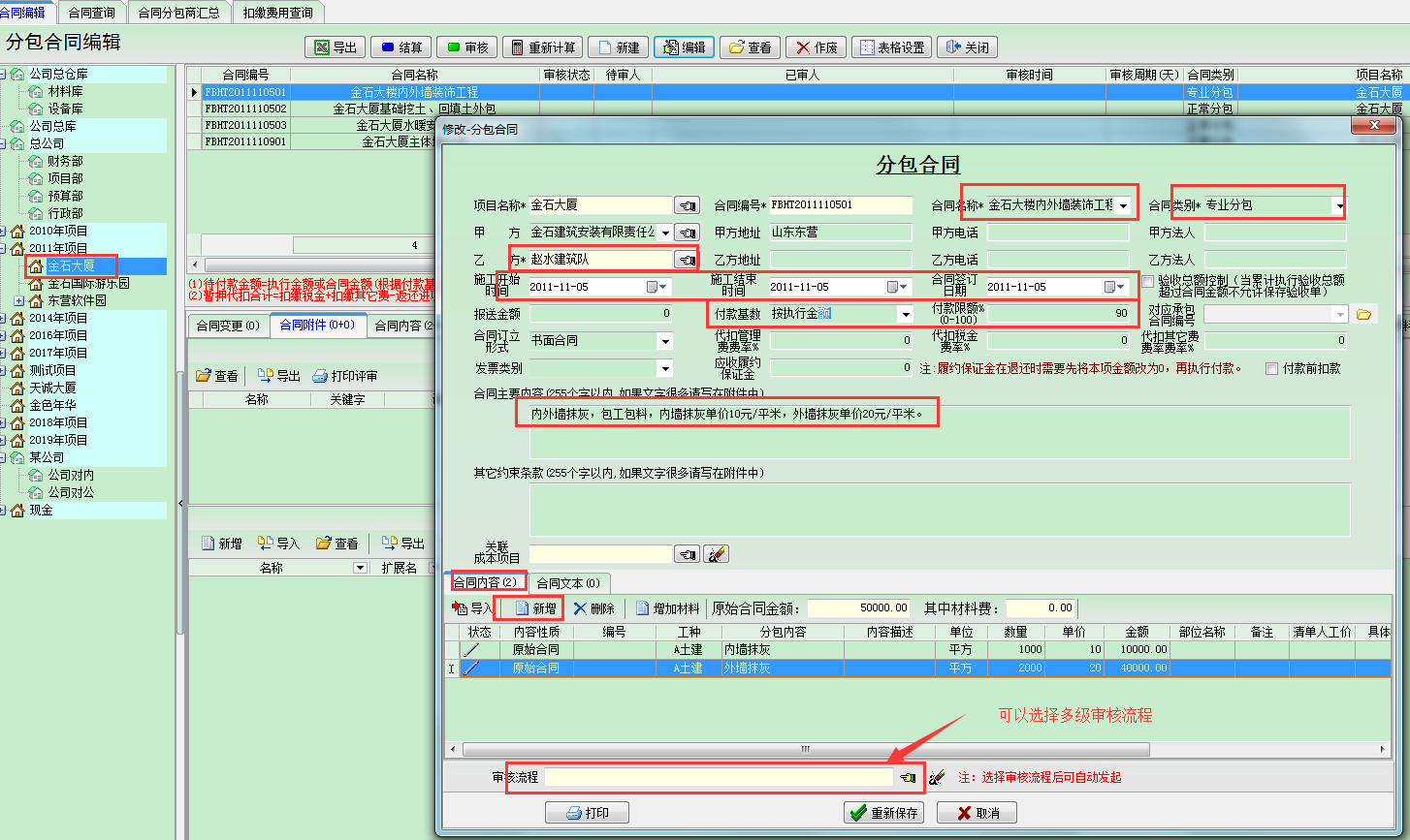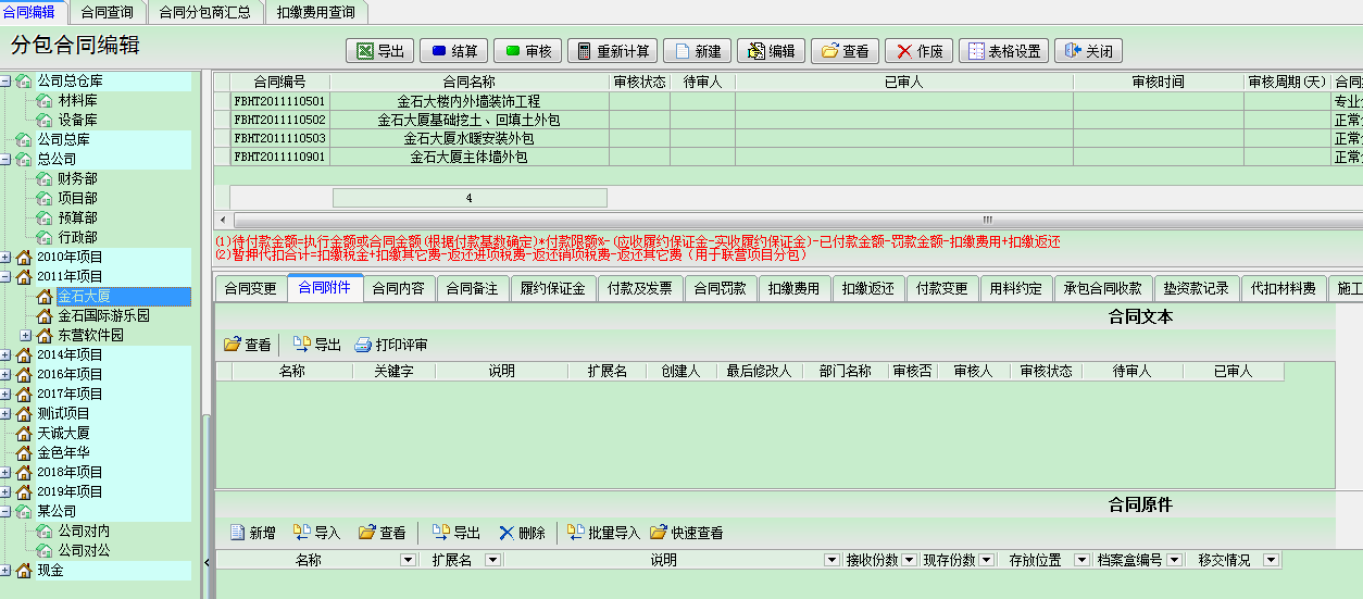在【合同編輯】中左半部分是合同的分類,分包合同也是按【項目維護】進行分類管理的。一個項目下可以建立多個合同,窗口的右上部分是合同列表,一行信息代表一個合同。右下部位是當前合同相關的內容:【合同附件】、【合同內容】、【合同備注】、【履約保證金】、【合同提醒】、【合同付款及相關發(fā)票】、【合同罰款】、【扣繳費用】、【合同材料約定】、【資質管理】、【合同借閱】。