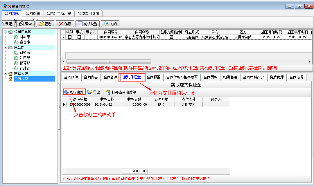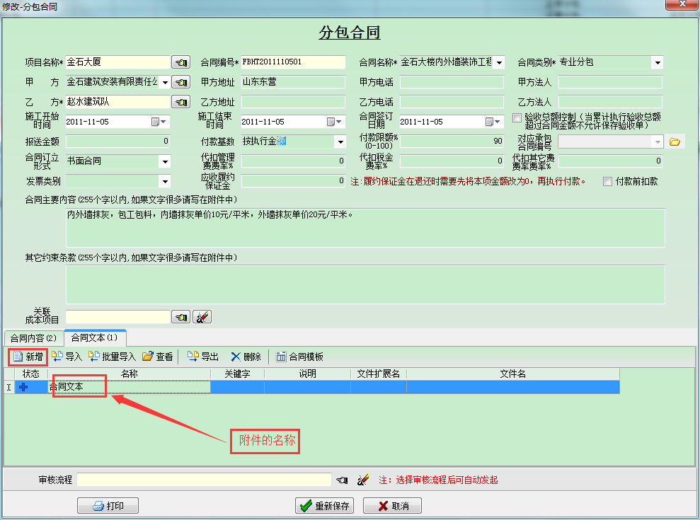 選中[金石大廈]項目點擊【新建】來建立一個合同,界面如下: