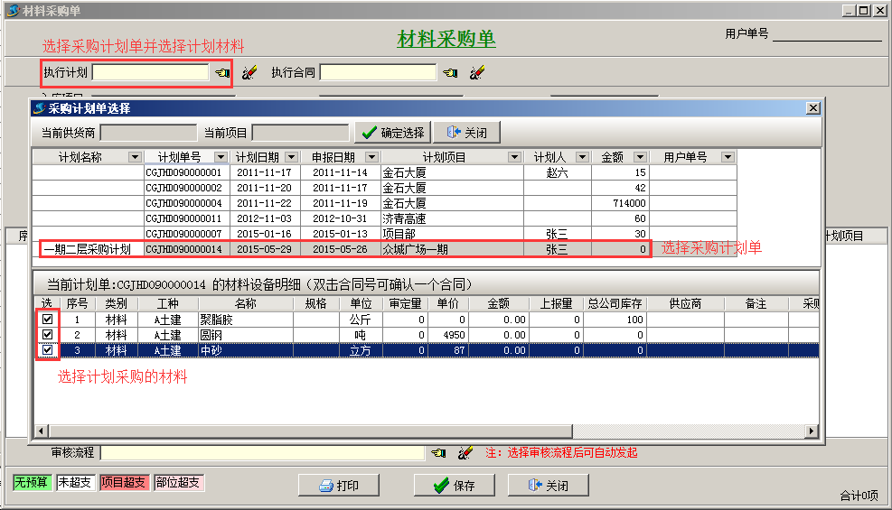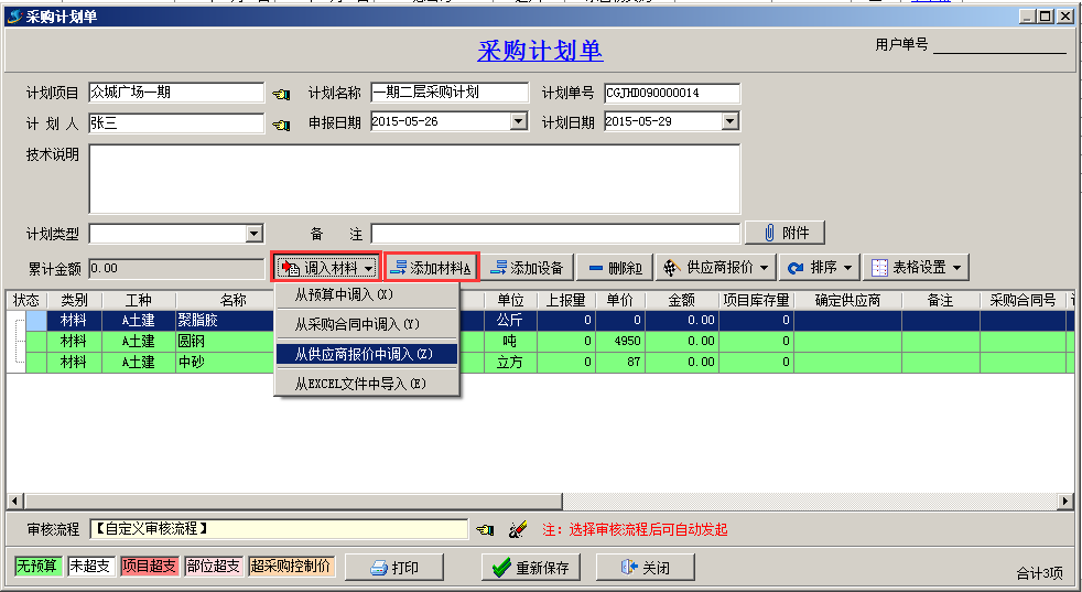 項目在工程項目管理軟件上報采購計劃,相關(guān)人員逐級審批通過,然后辦理采購,驗收入庫。(這種情況適合項目上大材批量采購,不需要簽訂供貨合同)。