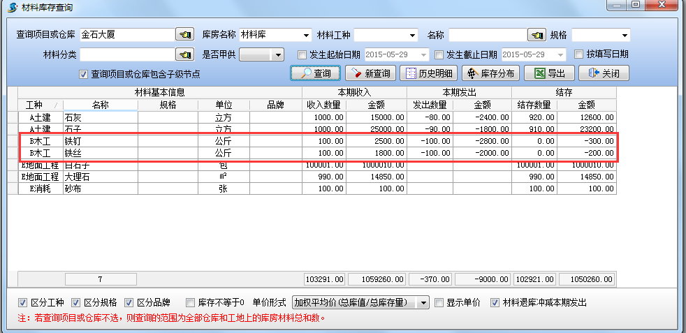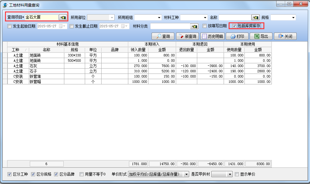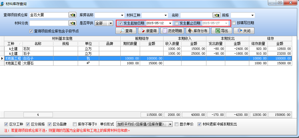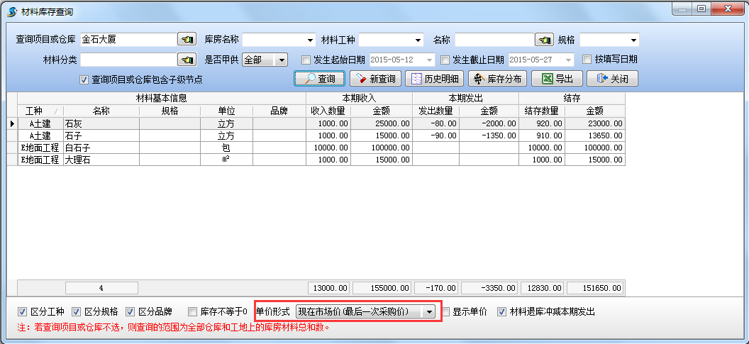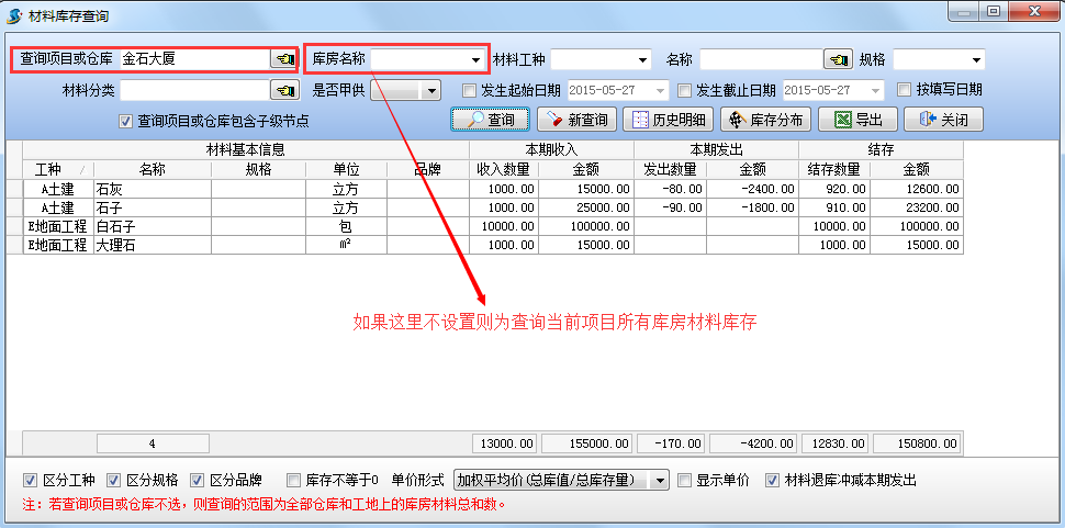設(shè)置查詢(xún)項(xiàng)目為【金石大廈】,查詢(xún)結(jié)果如下圖:查詢(xún)當(dāng)前項(xiàng)目【金石大廈】(包括所有庫(kù)房)的材料庫(kù)存情況。