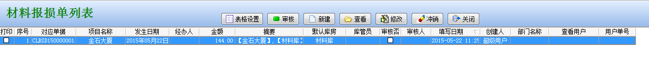 【保存】該單據(jù),返回到【材料報(bào)損單列表】窗口下,如下圖: