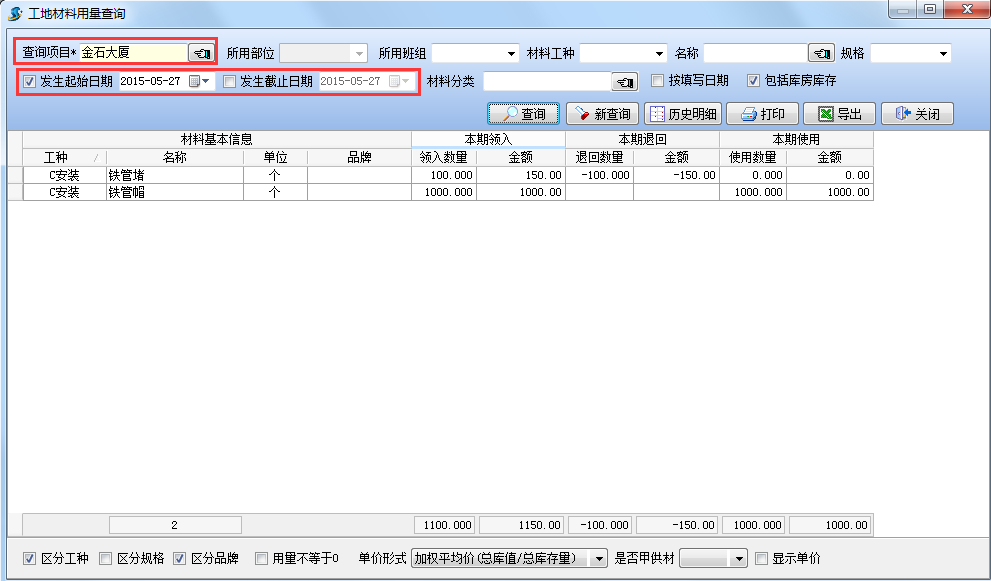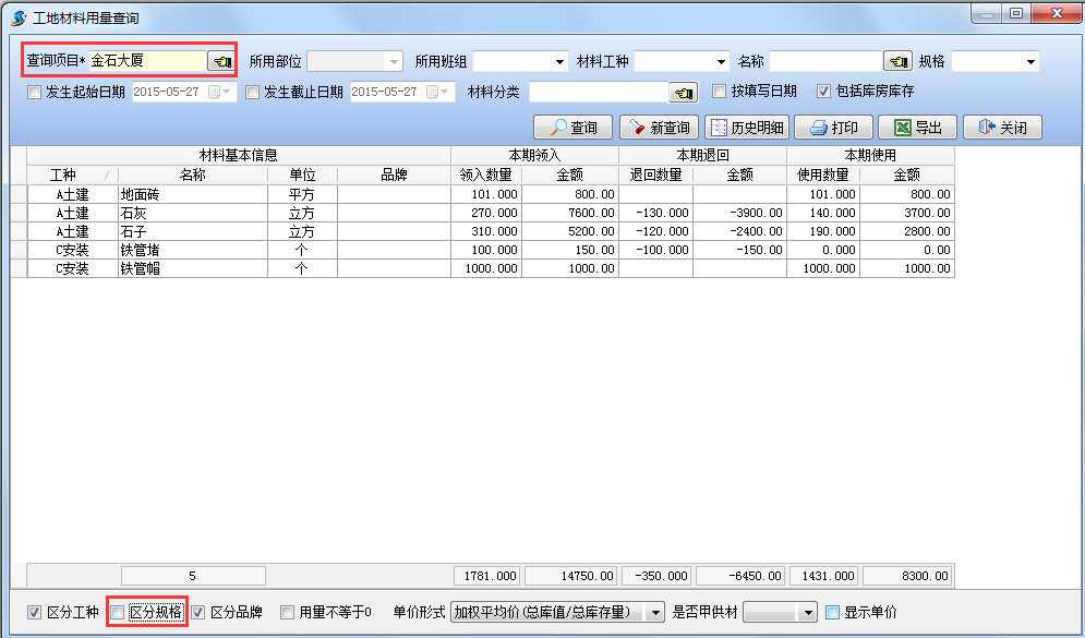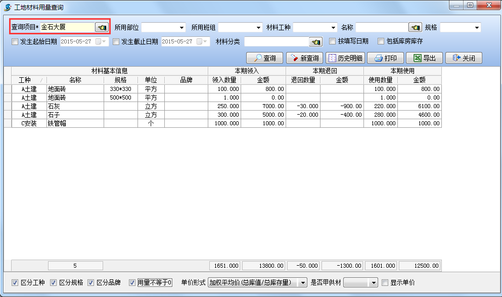 【工地材料用量查詢(xún)】是在工地現(xiàn)場(chǎng)材料管理中查詢(xún)工地材料用量,在查詢(xún)前需要設(shè)置查詢(xún)項(xiàng)目設(shè)置查詢(xún)項(xiàng)目為金石大廈,查詢(xún)結(jié)果如下圖: