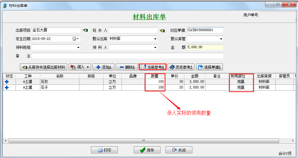 代入材料后,錄入實(shí)際的領(lǐng)用數(shù)量、所用部位,如下圖:
