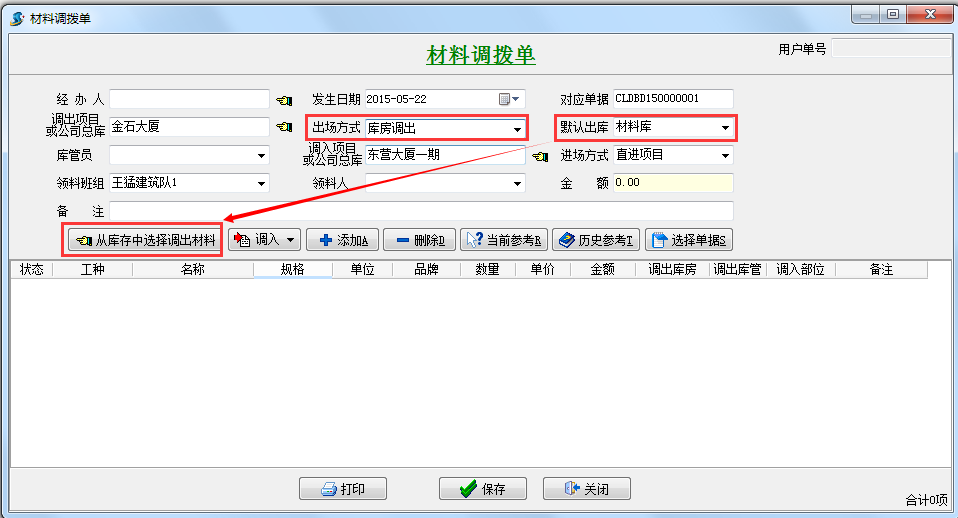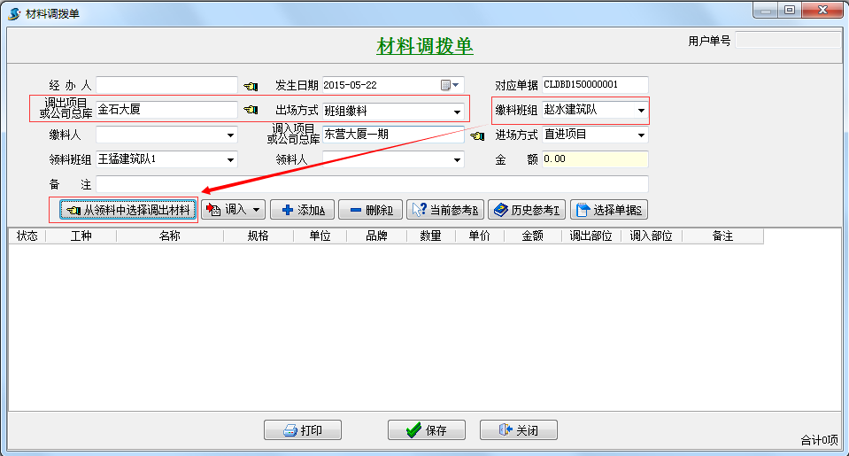 點(diǎn)擊主菜單【材料】->【材料調(diào)撥單】->【新建】打開(kāi)界面如下:
