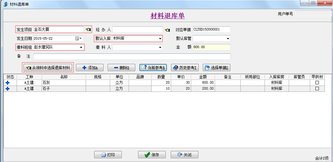 該單據(jù)影響【工程成本】、【工程材料成本對(duì)比】、【材料用量查詢(xún)】、【材料庫(kù)存查詢(xún)】、【項(xiàng)目材料總量、單平方用量對(duì)比表】、【材料庫(kù)存(項(xiàng)目用量)、采購(gòu)量匯總表】以及預(yù)算里的【材料對(duì)比表】、【材料超支查詢(xún)】、【項(xiàng)目材料超用、節(jié)余對(duì)比表】。