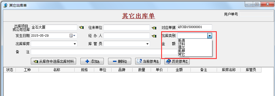 其它出庫(kù)單是指工地現(xiàn)場(chǎng)材料管理中其他方式的出庫(kù),例如用于抵債,還料,借出,抵押等。錄入本單據(jù)前,需先錄入要用到【材料維護(hù)】、【項(xiàng)目維護(hù)】(包括【庫(kù)房信息】)。該單據(jù)影響【工程成本】、【工程材料成本對(duì)比】、【材料用量查詢(xún)】、【材料庫(kù)存查詢(xún)】、【項(xiàng)目材料總量、單平方用量對(duì)比表】、【材料庫(kù)存(項(xiàng)目用量)、采購(gòu)量匯總表】點(diǎn)擊主菜單【材料】->【其他出庫(kù)單】->【新建】打開(kāi) 新建【其他出庫(kù)單】窗口 界面如下: