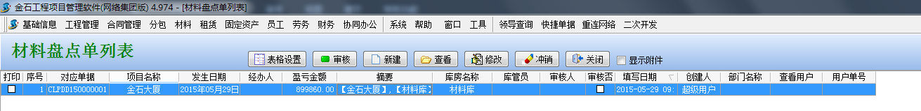【材料盤(pán)點(diǎn)單】用來(lái)工地現(xiàn)場(chǎng)材料管理中重新盤(pán)點(diǎn)材料的實(shí)際庫(kù)存,當(dāng)盤(pán)點(diǎn)的實(shí)際庫(kù)存與軟件庫(kù)存不符時(shí),會(huì)產(chǎn)生盤(pán)點(diǎn)的盈虧數(shù)量、金額。從而影響系統(tǒng)中的材料庫(kù)存。一般該功能用于初期使用軟件建立庫(kù)存、或工程竣工重新盤(pán)點(diǎn)庫(kù)存。錄入本單據(jù)前,需先錄入要用到【材料維護(hù)】、【項(xiàng)目維護(hù)】(包括【庫(kù)房信息】)。