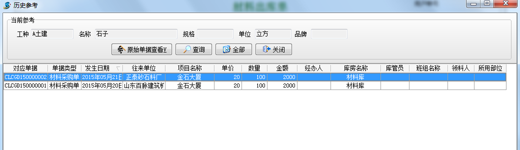 選中材料【石子】點(diǎn)擊【歷史參考】,可以看【石子】的歷史明細(xì)記錄,如下圖