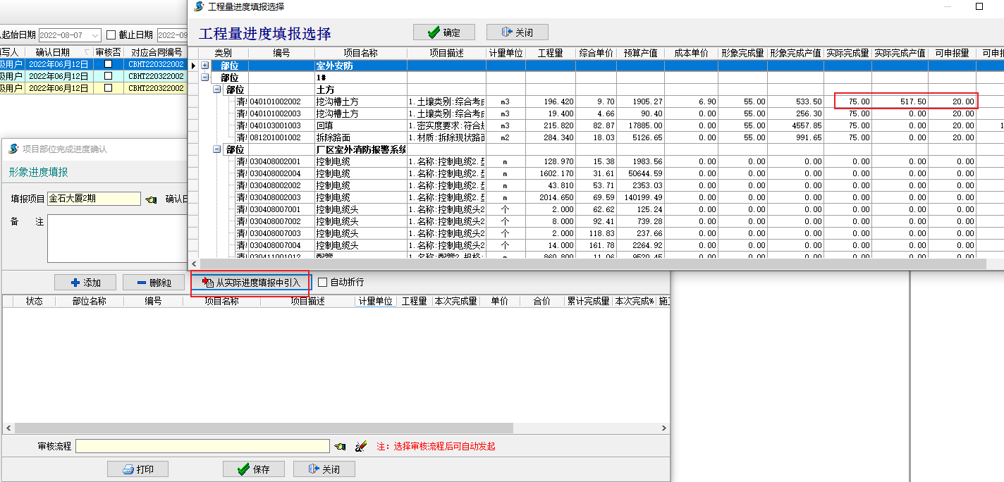 若選擇形象進(jìn)度時(shí),可以選擇從實(shí)際進(jìn)度填報(bào)中引入,選擇已經(jīng)發(fā)生實(shí)際填報(bào)的清單,雙擊調(diào)入過來,然后依次對(duì)本次完成量或完成百分比進(jìn)行輸入,此時(shí)的單價(jià)為【部分分解及工程量清單】中的綜合單價(jià),本步驟完成后,可以看到當(dāng)前進(jìn)度填報(bào)的產(chǎn)值,接下來可以打印或者導(dǎo)出,為甲方申報(bào)進(jìn)度款使用。