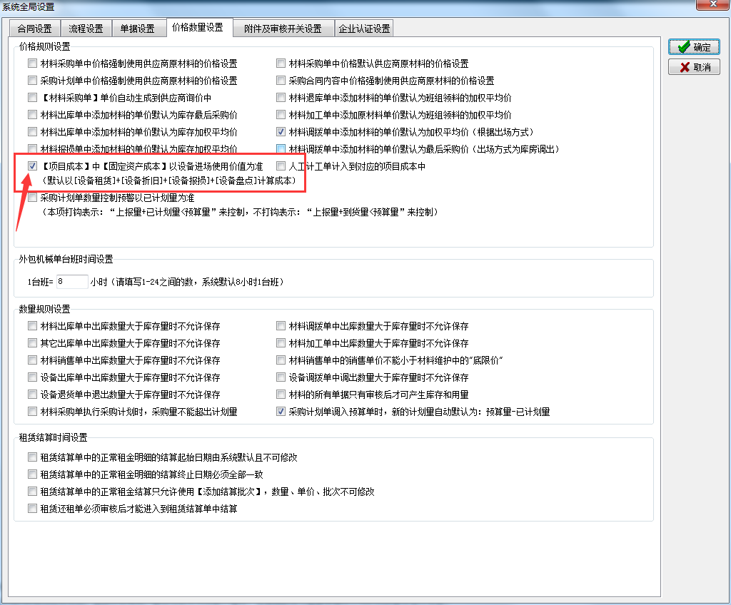 設(shè)備成本計算方法(二) 在工程項目管理軟件【系統(tǒng)維護】-【系統(tǒng)全局設(shè)置】-【價格數(shù)量設(shè)置中】有設(shè)備計算成本方式的控制開關(guān),如下圖:
