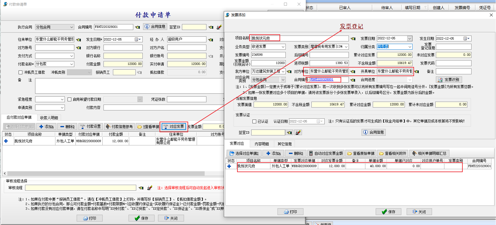 金石工程管理軟件新增付款申請單界面可直接做發(fā)票登記