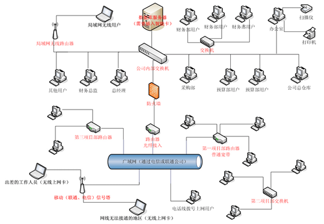 《金石建筑工地管理系統(tǒng)》在綜合了建筑企業(yè)在網(wǎng)絡(luò)辦公要求后,實(shí)結(jié)合了該公司的實(shí)際需求建立了如上圖所示的公司辦公平臺(tái)。在硬件上,使用最經(jīng)濟(jì)、性?xún)r(jià)比較高、安全性很強(qiáng)的設(shè)備建立既能滿足公司現(xiàn)階段需求有能符合將來(lái)一段時(shí)間內(nèi)的信息化需要的硬件設(shè)施,并為公司以后硬件及信息化發(fā)展預(yù)留充裕的空間及相關(guān)接口。在軟件上建立專(zhuān)門(mén)的對(duì)內(nèi)和對(duì)外的信息通道,對(duì)內(nèi)串聯(lián)公司各科室部門(mén),對(duì)項(xiàng)目部進(jìn)行有效監(jiān)管,并為項(xiàng)目部提供高效的上報(bào)及反應(yīng)通道,實(shí)現(xiàn)公司內(nèi)部的信息高速互通;對(duì)外建立公司的信息發(fā)布平臺(tái),及時(shí)的為公司相關(guān)外來(lái)的單位發(fā)布公司及項(xiàng)目信息。