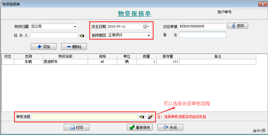 【物資報(bào)損單】是用來報(bào)損物資的業(yè)務(wù)單據(jù)。 類似【材料報(bào)損單】或者【設(shè)備報(bào)損單】,一個(gè)是針對(duì)物資報(bào)損,一個(gè)是針對(duì)材料或者設(shè)備報(bào)損。