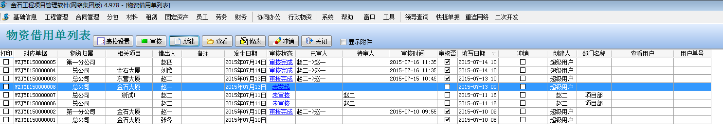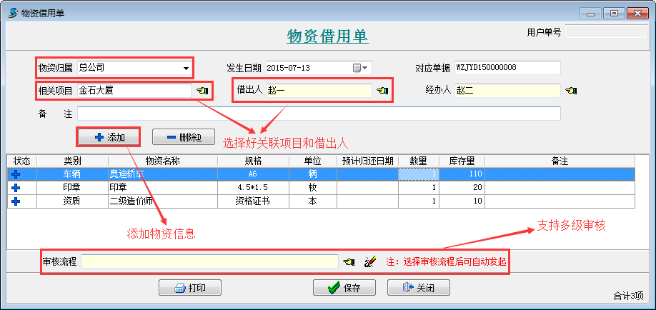 點擊主菜單中的【行政物資】->【物資借用單】打開物資借用單列表 點【新建】按鈕,錄入如下: