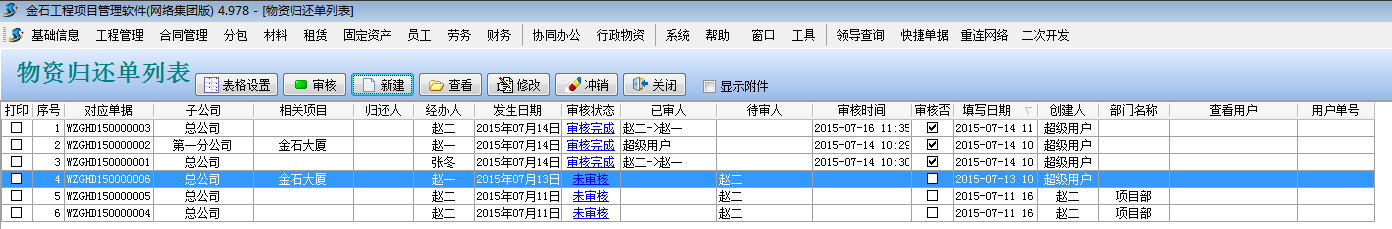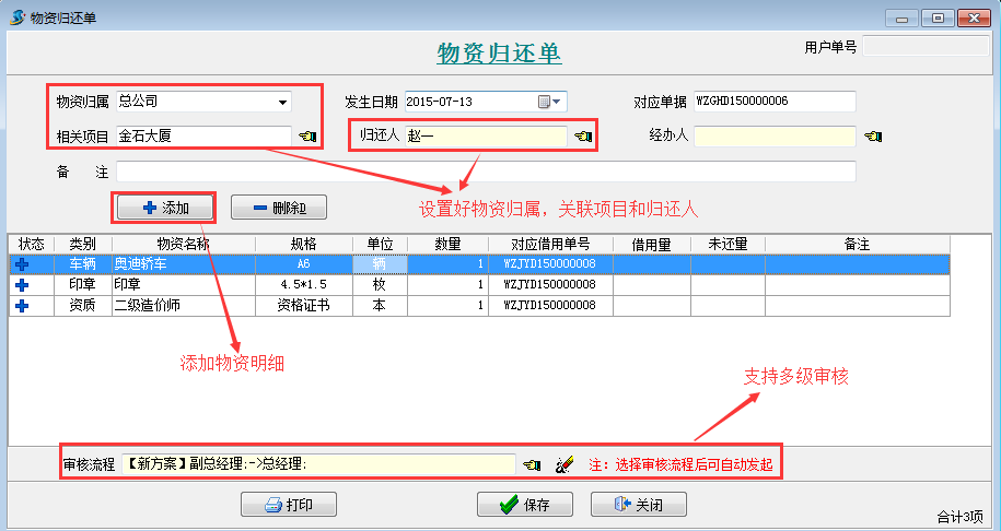 備注:在填寫物資歸還單時,必須對應(yīng)借用單號,按照物資借用單單號歸還物資。