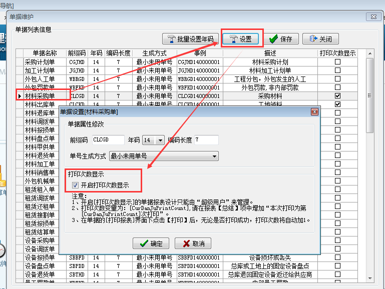 登錄超級用戶,在菜單欄【系統(tǒng)】-【單據(jù)維護(hù)】找到對應(yīng)業(yè)務(wù)單據(jù),點(diǎn)擊設(shè)置按鈕在開啟打印次數(shù)顯示處打上對勾,然后點(diǎn)擊確定。如下圖: