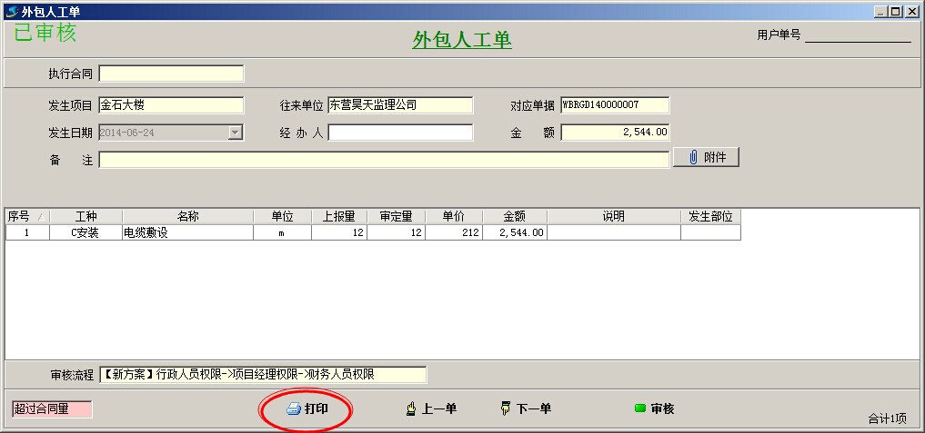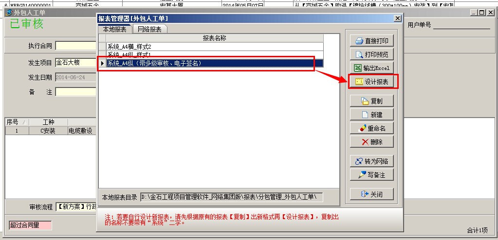 以下圖的外包人工單為例說明,點擊打印,選擇帶電子簽名的報表,點設(shè)計報表