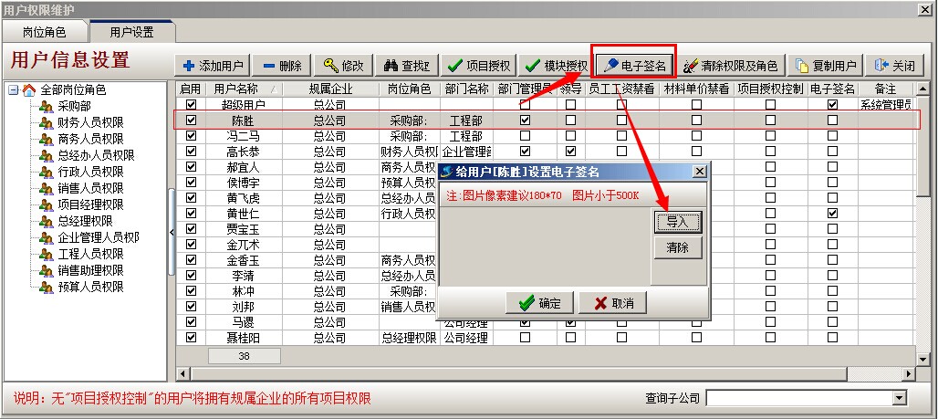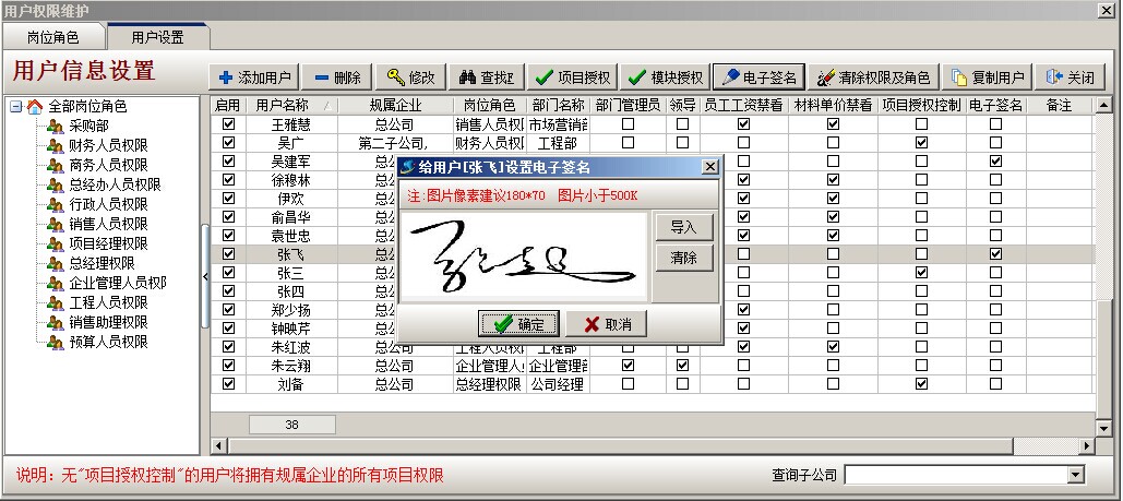 登陸超級用戶,選擇系統(tǒng)維護模塊,打開用戶管理權(quán)限設(shè)置,選擇需要設(shè)置電子簽名的用戶,點上面的電子簽名,對應(yīng)導(dǎo)入提前設(shè)置好的電子簽名圖片(jpg格式)