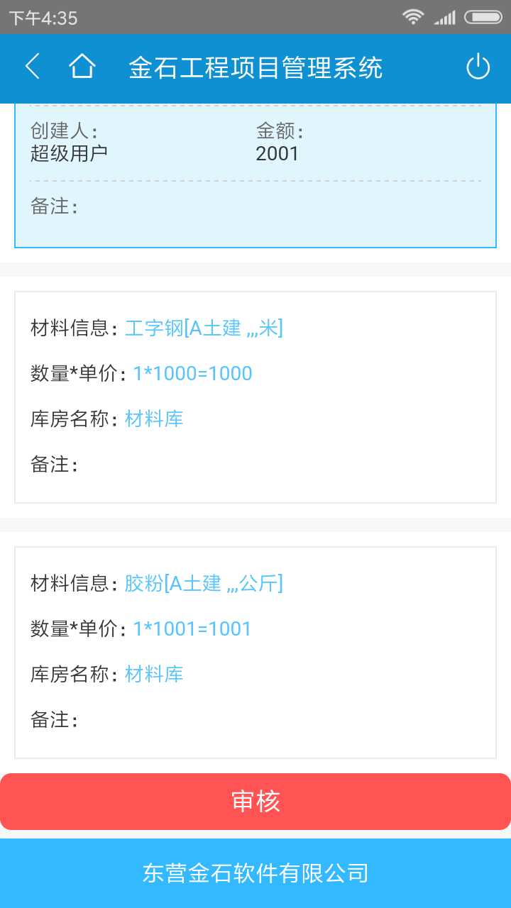 2.金石工程管理軟件手機端的操作,在配置好企業(yè)微信的前提下,進入手機端的單據填寫并打開審核中心,如圖所示 點紅色的審核鍵進入“簽名區(qū)域”輸入審核人→輸出簽名→提交