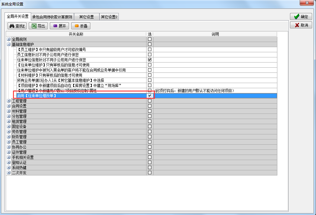 使用該功能之前需在【系統(tǒng)全局設置】中開啟‘啟用【往來單位增改單】’,開啟后可以使用往來單位增改單新增或者修改往來單位,同時往來單位維護禁止使用新增和修改功能。