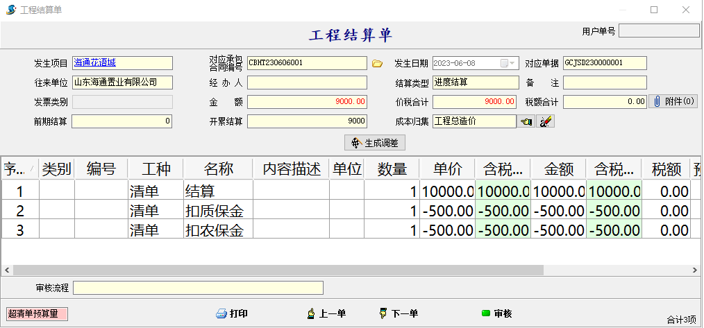 【工程結算單】增加成本歸集功能,可通過成本計劃單設置暫估收入,工程結算單產(chǎn)生結算收入,成本利潤表查詢自定義成本、利潤 。