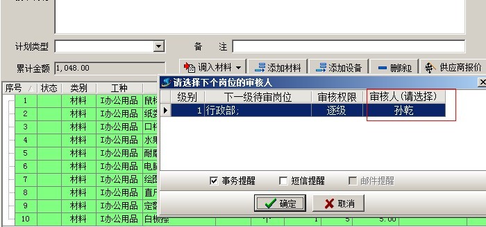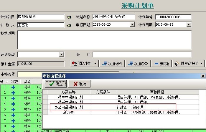 方案設(shè)置完成后,用戶在創(chuàng)建單據(jù)的時候根據(jù)不同的情況就可以選擇不同的方案,例如:如果公司行政部要采購辦公用品,那么他們在做采購計劃單的時候,審核方案就可以選擇辦公用品方案。如下圖: