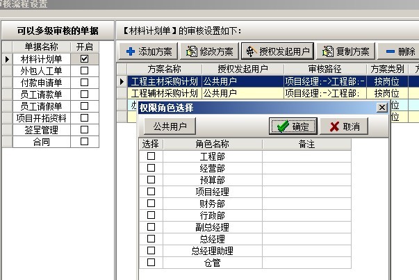 在多級審核中,可以設(shè)置多套審核方案,每套方案可設(shè)置多個崗位,可設(shè)置方案的授權(quán)發(fā)起用戶(在業(yè)務(wù)單據(jù)中選擇該審核方案的用戶)。在添加方案時,有三種方式逐級審核、平級審核、跨級審核。逐級審核是指各個崗位按先后順序依次審核該業(yè)務(wù)單據(jù),例如審核順序為,工程部、預(yù)算部、經(jīng)營部、總經(jīng)理如下圖: