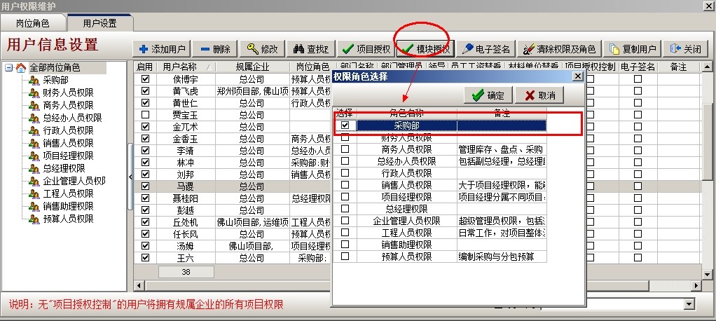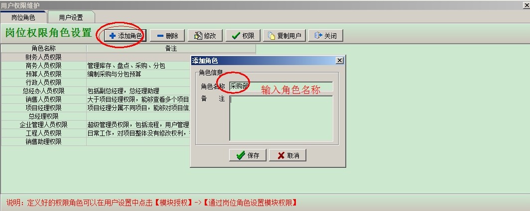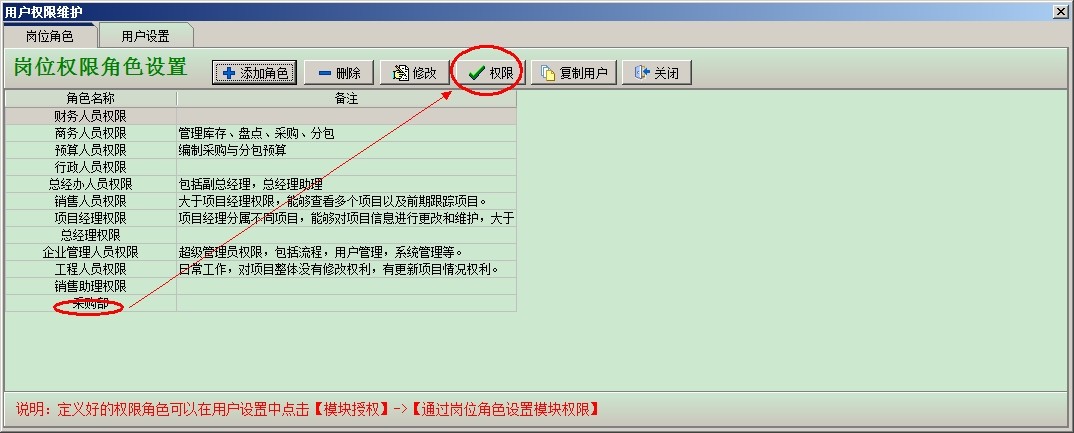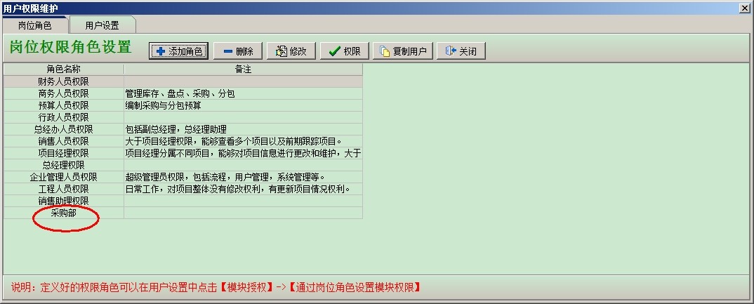 設(shè)置采購(gòu)部這個(gè)角色的【權(quán)限】