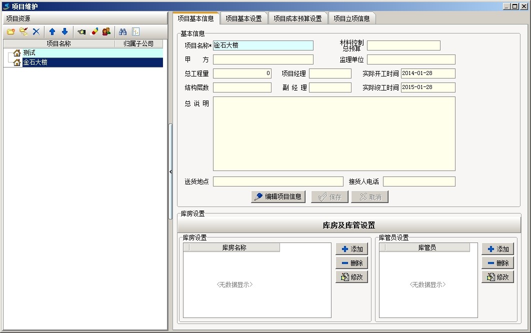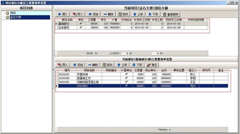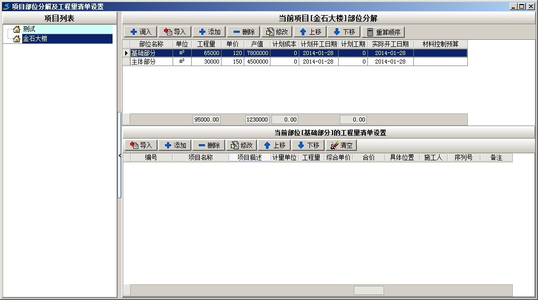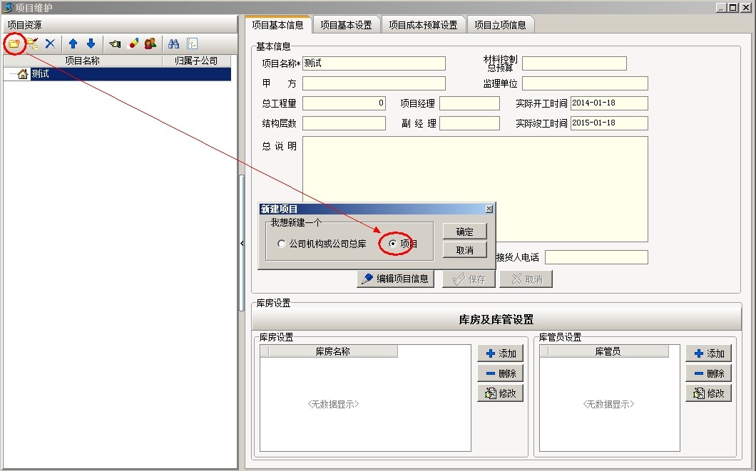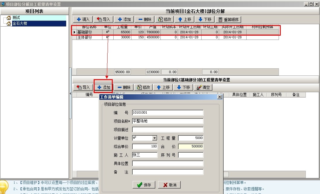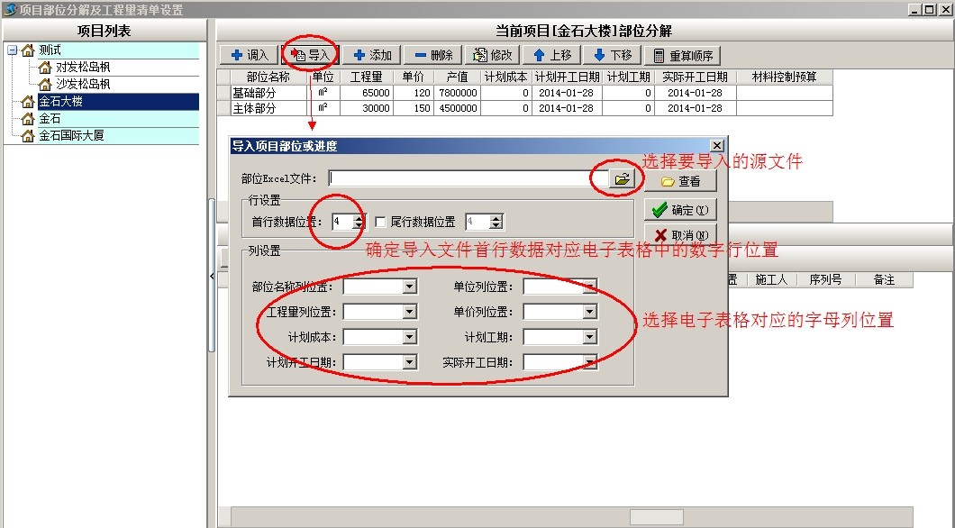 上圖是工地常用部位劃分的部分清單內(nèi)容,下面以上面截圖為例說(shuō)明軟件中工程的部位劃分,首先新建項(xiàng)目金石大樓