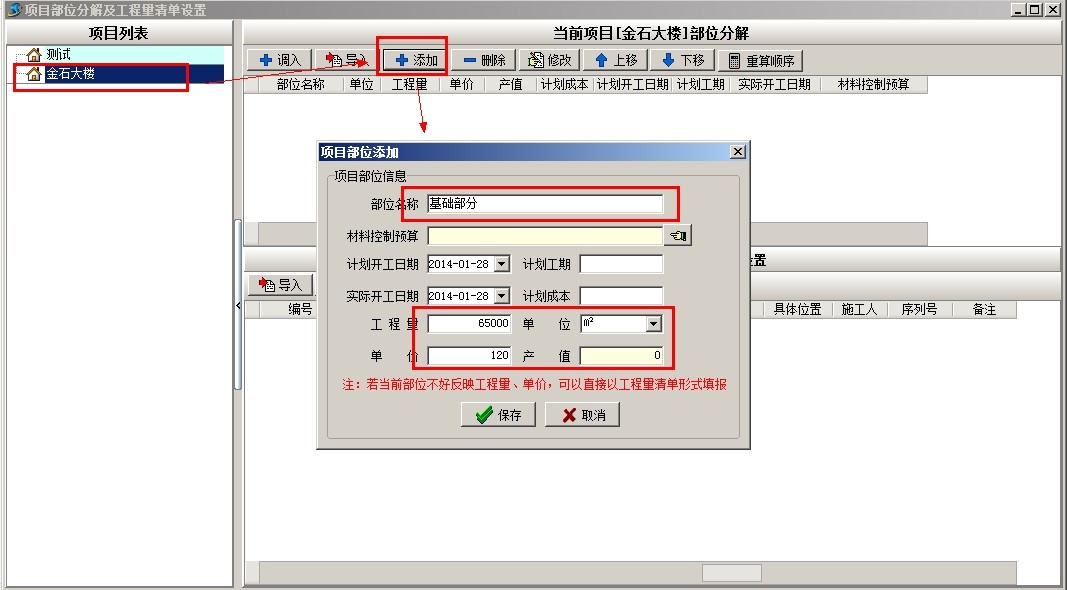 選中項(xiàng)目,點(diǎn)當(dāng)前項(xiàng)目部位分解的添加,彈出添加窗口,填寫部位名稱、工程量、單位等相關(guān)信息,多個(gè)部位需要多次添加。也可以使用簡(jiǎn)單方法,做好EXCEL電子表格,導(dǎo)入
