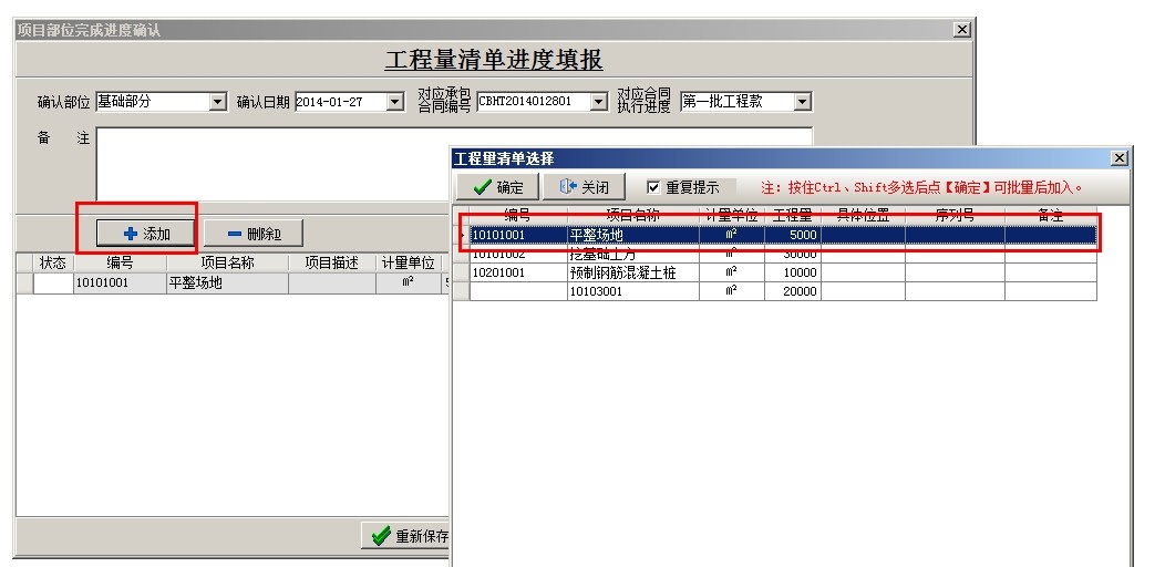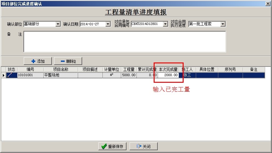 選中相應(yīng)的項(xiàng)目,點(diǎn)擊新建,填出工程量進(jìn)度填報(bào)窗口,選擇部位名稱,可以選擇關(guān)聯(lián)項(xiàng)目對(duì)應(yīng)的承包合同號(hào)和承包合同執(zhí)行進(jìn)度,然后點(diǎn)添加,調(diào)入清單內(nèi)容,在本次完成量處輸入已完成的工作量,不限制錄入進(jìn)度填報(bào),直至清單工作量完成,調(diào)入下一項(xiàng)清單內(nèi)容(如某項(xiàng)清單實(shí)際工程量超過(guò)清單預(yù)算量,可以繼續(xù)填報(bào))