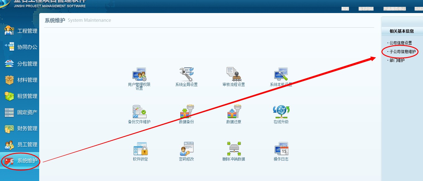 一、 項目按分公司授權 (注:適用于有分公司的的企業(yè)使用)1、首先登錄超級用戶,導航欄---系統維護---子公司信息維護中設置幾個子公司名稱。