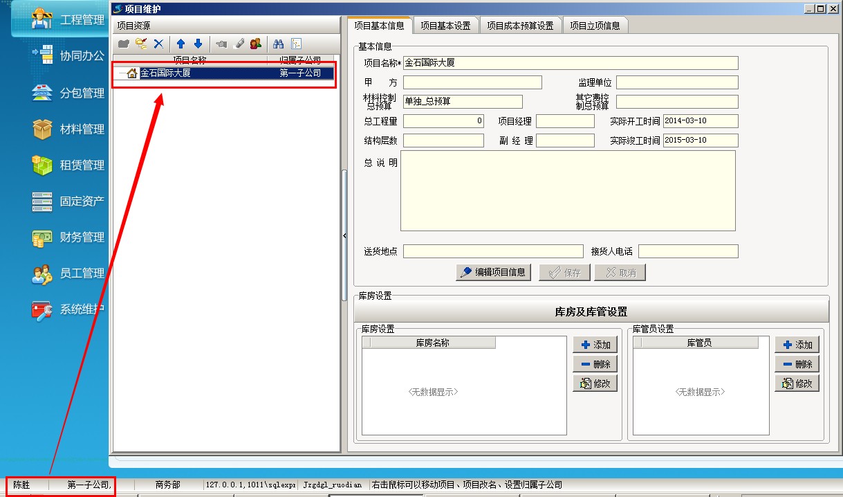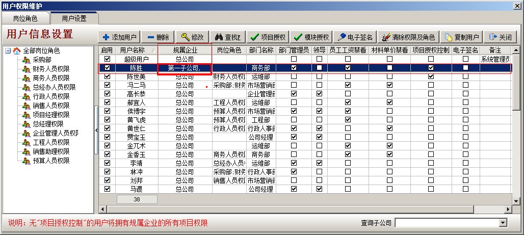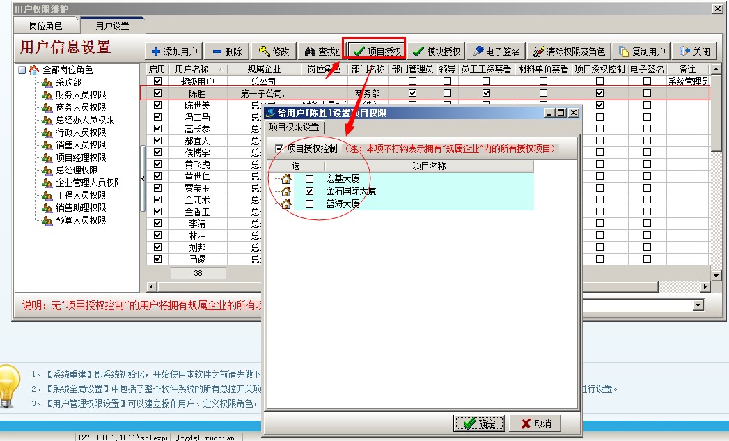 二、 項目按個人授權 (注:適合普通企業(yè) 或 集團公司下的分公司) 1、 以剛才陳勝為例,只讓他看到金石國際大廈 項目 (配合上面的項目按分公司授權,這樣就可以實現集團公司的項目二級授權)具體操作:登錄超級用戶---系統維護---打開用戶管理權限設置,選擇員工陳勝,點項目授權,開啟項目授權控制,在金石國際大廈這個項目前面打鉤