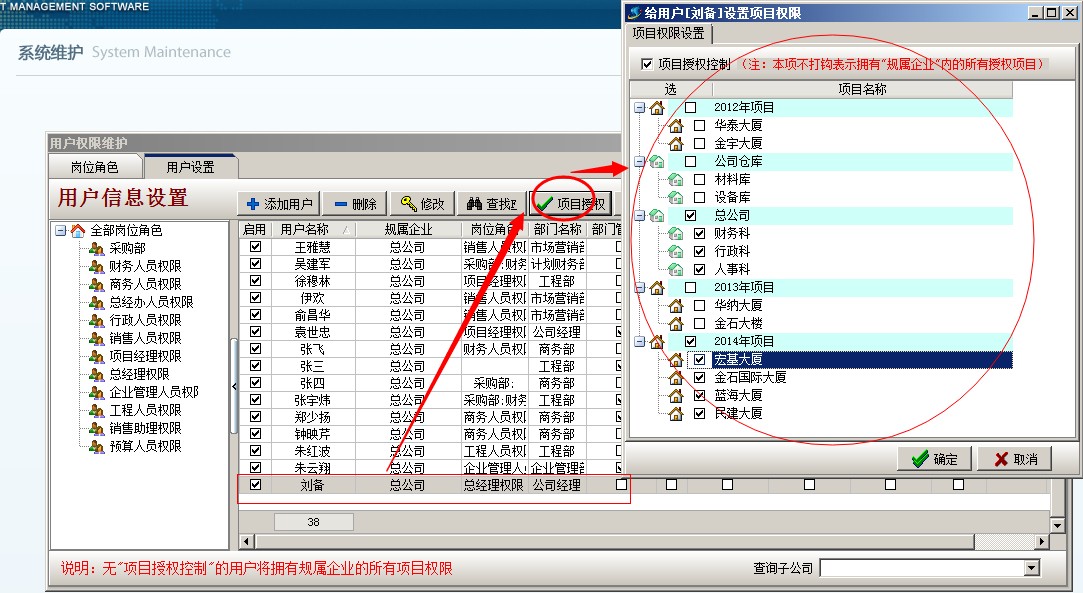 登錄超級用戶---系統維護---用戶管理權限設置,選中劉備,點項目授權,設置劉備有部分項目權限,如下圖