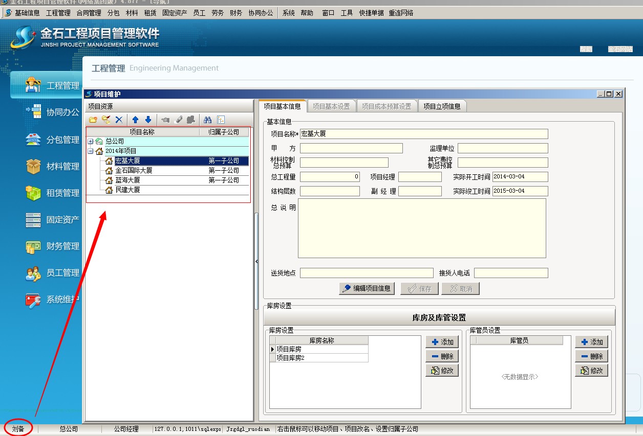 2、 建立用戶劉備 為總公司 直接 項目授權 ,再登陸看下效果 首先建立劉備為總公司人員,擁有所有的項目權限,如下圖所示